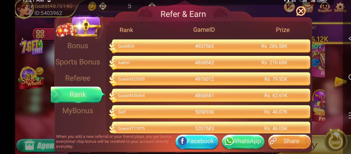 Players can receive bonuses just by logging in daily. The app also offers mission-based rewards, referral bonuses, level-based rewards, and tournament prizes.